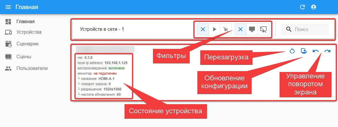 Для каждого устройства можно выполнить: удаленную перезагрузку