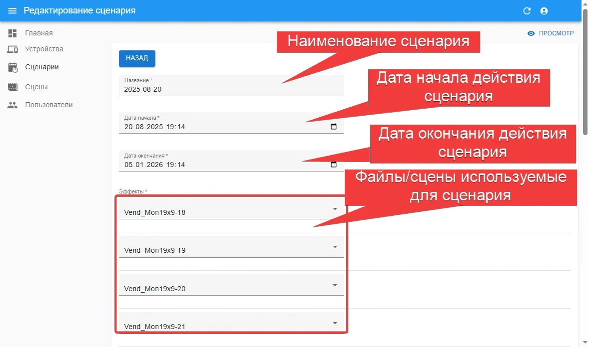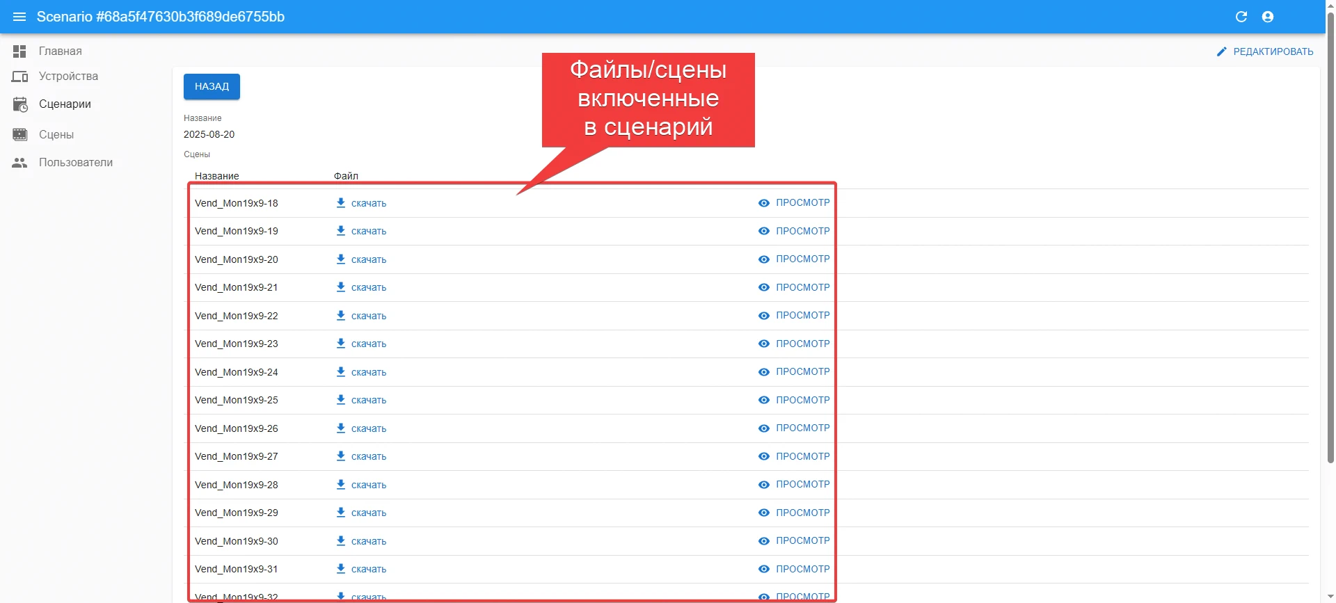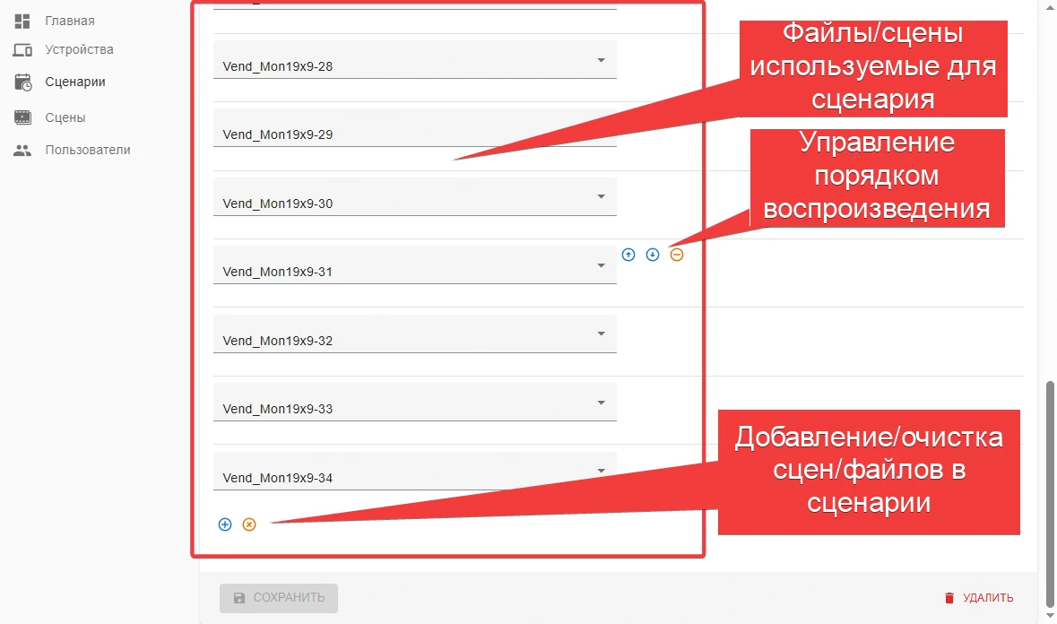 Сценарии - собранный в единую группу комплект медиафайлов (сцен) с заданными сроками начала и окончания действия комплекта.