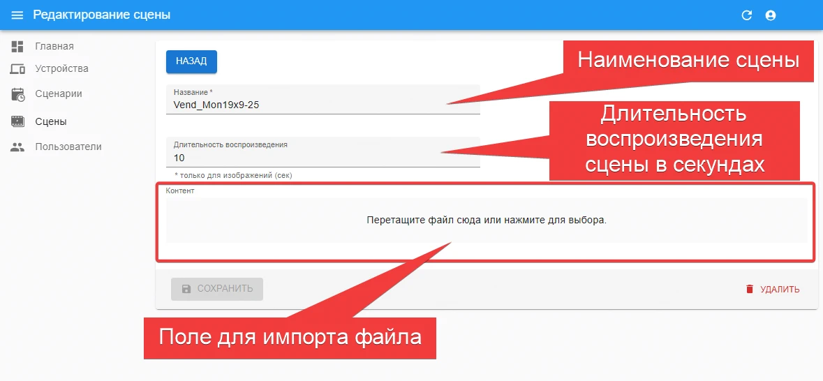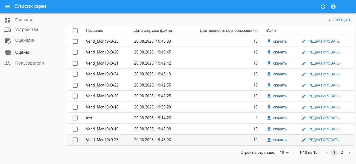 Сцена - один медиафайл (изображение или видео), с указанием продолжительности отображения.